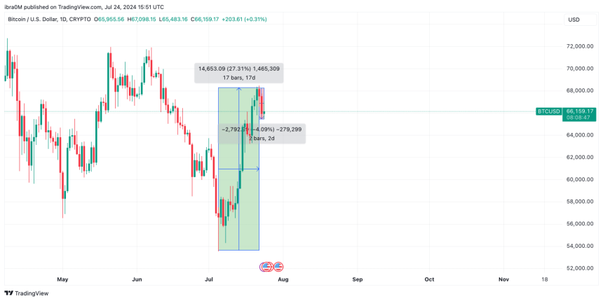 Since BTC reached a 30-day peak of $68,477 on July 22, it has entered a mild 4% correction phase, tumbling toward $66,160 at the time of writing on Wednesday July 24.