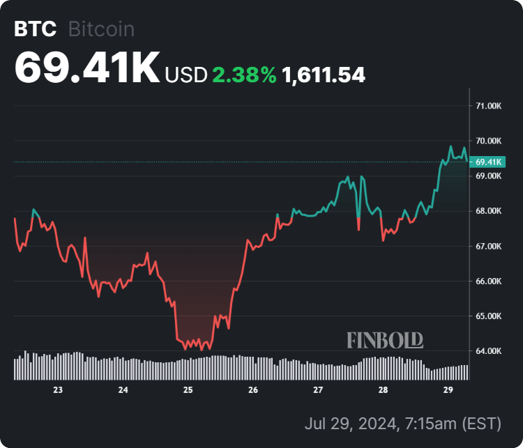 At press time, Bitcoin was changing hands at a price of $69,410, up 2.45% on the day, as well as advancing 2.38% across the past week, and adding up to the monthly gain of 14.10%, according to the most recent chart information retrieved by Finbold on July 29.