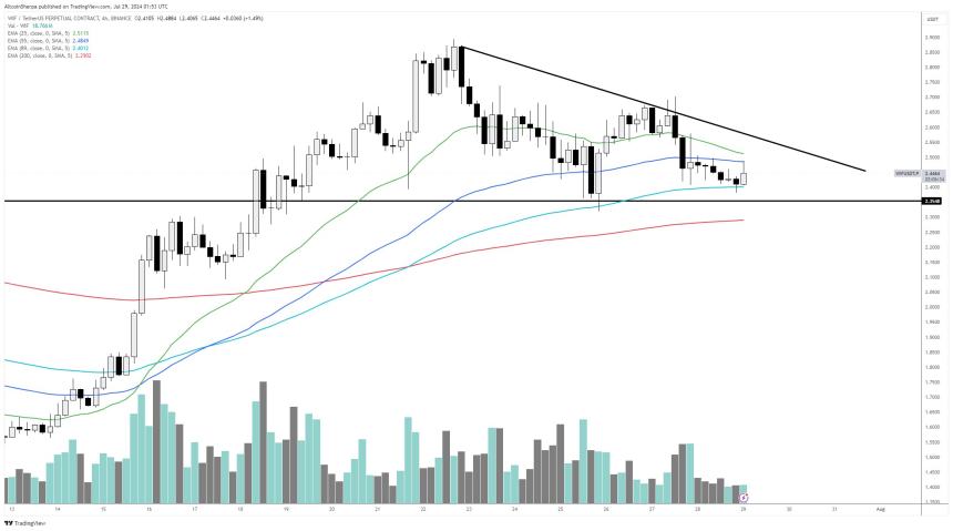 Looking at WIF, the trader appears to suggest that the altcoin is approaching its diagonal resistance hovering at $2.50. WIF is trading at $2.33 at time of writing.