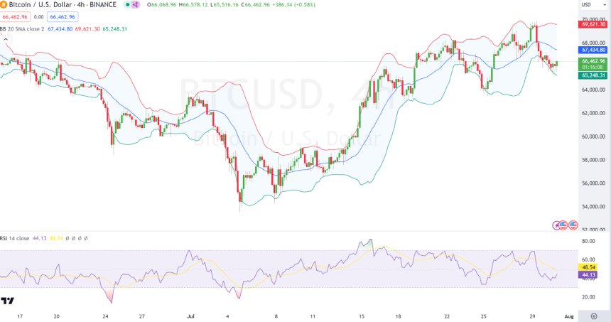 On the other hand, the Relative Strength Index (RSI) is at 48.54, suggesting neutral momentum. Bitcoin traded at $66,344 as of press time, representing a 0.63% decrease over the last 24 hours.