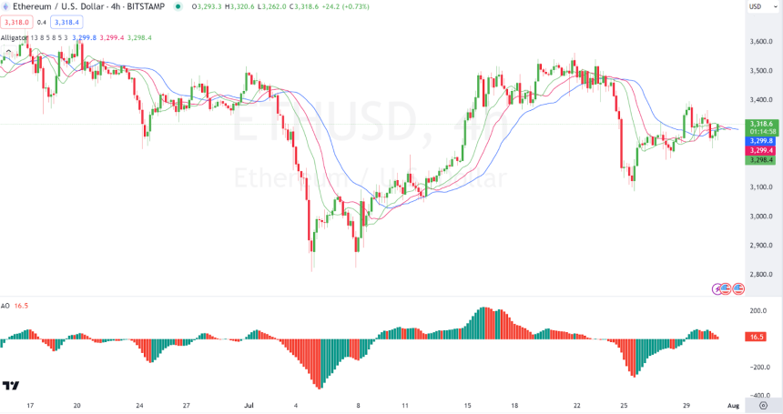 Ethereum, $ETH, has also failed to post gains in today‘s session, as seen from its price movements. According to an in-depth analysis, the Alligator lines are intertwined, indicating a lack of a clear trend and potential consolidation. The recent Ethereum price movement is above the Alligator’s mouth, hinting at a possible bullish trend if the price maintains above these levels.