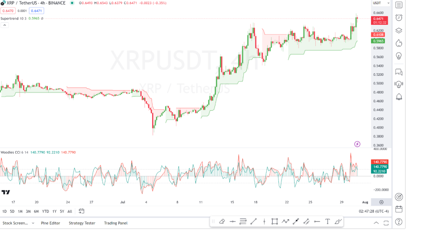 Ripple, $XRP, is among the gainers in todays session, as seen from the price movements. An in-depth analysis shows that the Supertrend is currently green, suggesting an uptrend. XRP is trading above the Supertrend support level of $0.5965.