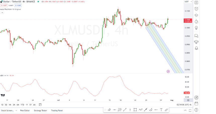 Stellar, $XLM, is also among the gainers in todays session, as seen from the price movements. An in-depth analysis shows that the Stellar price is currently near the median line of the pitchfork, indicating a neutral position within the channel.