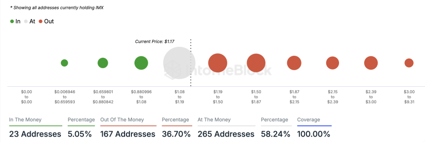 Interestingly, 58.24% of IMX‘s daily active addresses are “at the money.” This means that the average purchase price of these addresses is equal to the altcoin’s current market price. Essentially, these addresses have broken even on their investment and have made neither profit nor losses.