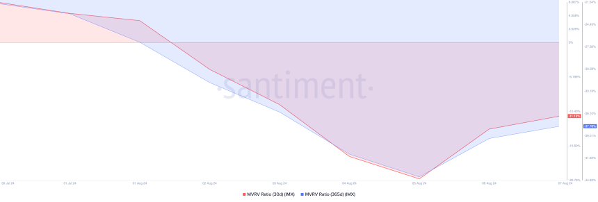 For traders looking to trade against the market, IMX‘s market value to realized value (MVRV) ratio has flashed a buying opportunity. This metric returns negative values when assessed over different moving averages. According to Santiment, IMX’s 30-day and 90-day MVRV ratios are -11.13 and -37.78, respectively.
