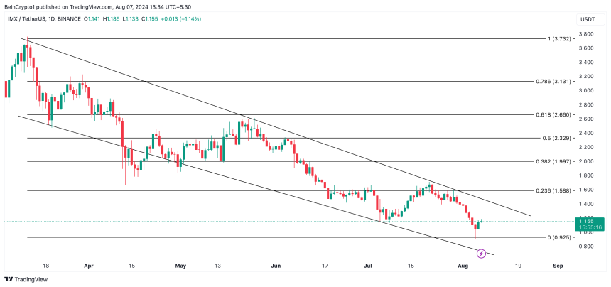 If IMX continues to trend within this channel, its price might fall to $0.92 and aim for the lower line, which currently forms support at $0.67.