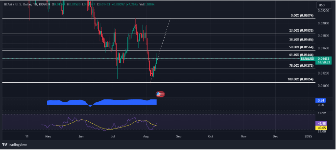 If the breakthrough continues, investors and traders should aim to settle on $0.01685 for the long term, giving BEAM strong support for further upward movement. However, if the opposite happens, the token might dive below $0.01444, settling in the $0.1054-$0.01273 price range.