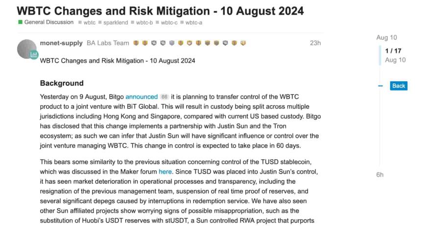 On August 10, a BA Labs spokesperson raised a risk-mitigation issue related to wBTC changes on MakerDAOs (MKR) governance forum. As explained in the proposal, Bitgo announced a plan to transfer control of wBTC to a joint venture with BiT Global.