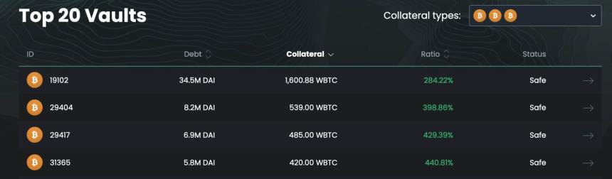 To measure its potential impacts, it is important to understand that investors need to deposit approximately three times wBTCs nominal value to redeem DAI, evidenced by the top 20 vaults using one of the three wBTC contracts. For example, the vault 19102 has 1,600.88 wBTC collateral for a 34.5 million DAI debt.