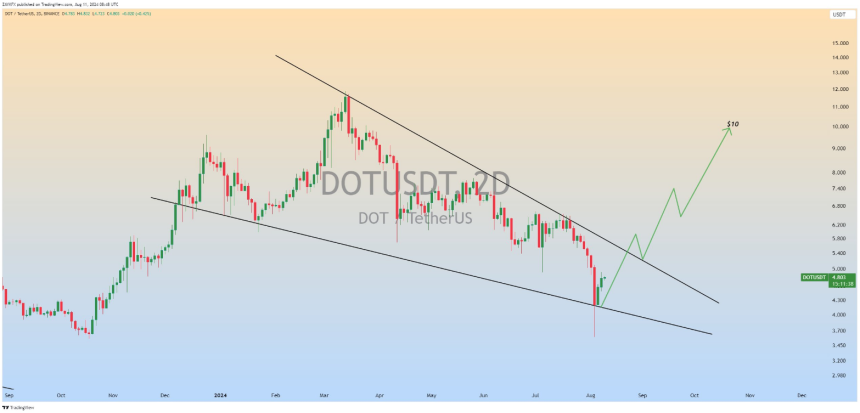Something is literally now hyping in the air, particularly after the analysis of the popular crypto analyst known as “Zayk Charts.” The analyst observed a falling wedge pattern on the 2-day chart for DOT/USDT, and it could truly be a game-changer.
