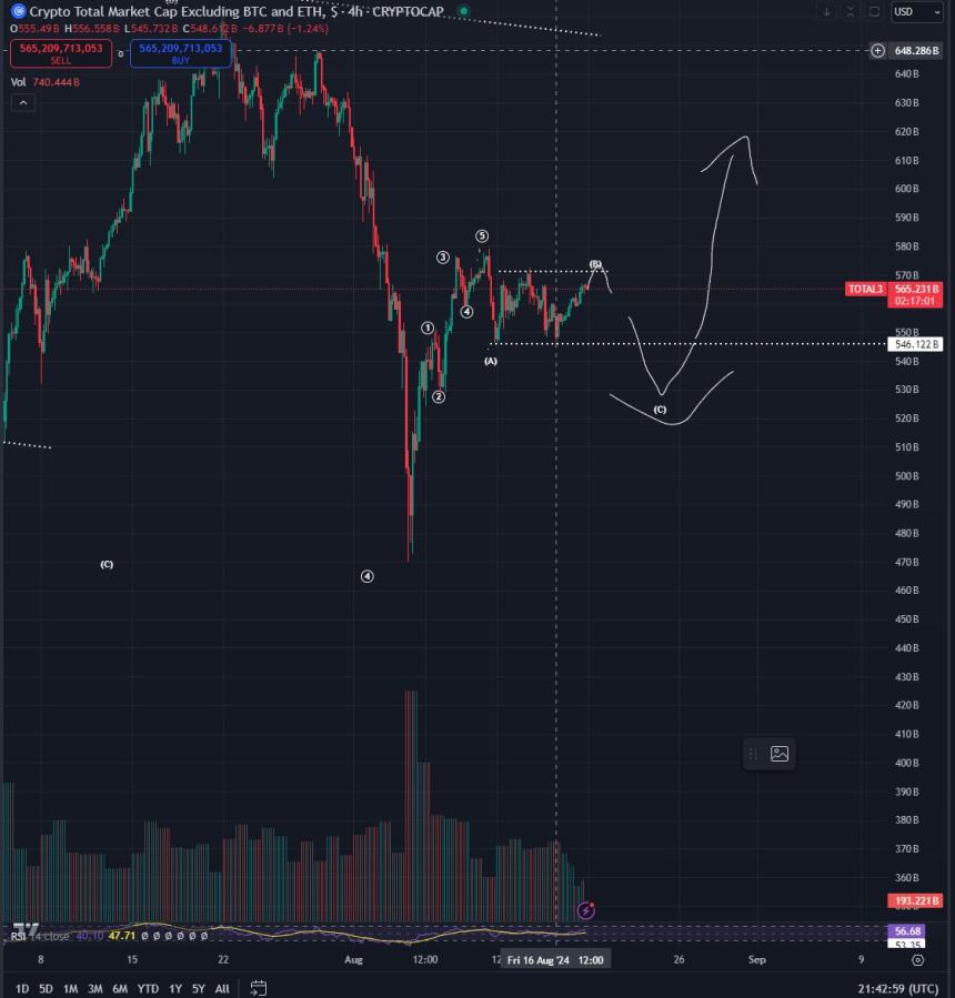 The analyst practices the Elliott Wave theory, which states that a bullish asset tends to witness rallies after completing an ABC move down. Based on the traders chart, he seems to predict that TOTAL3 will drop to $530 billion for the C wave before rallying to $620 billion.