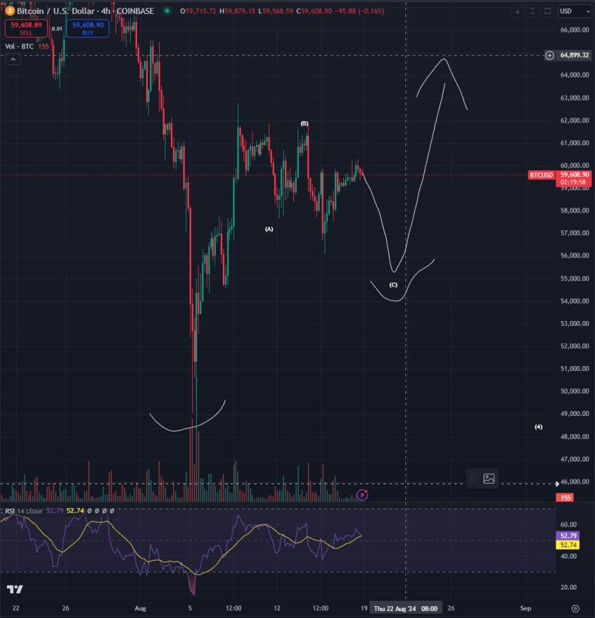 Looking at Bitcoin, the trader thinks that BTC is also due for a C-wave correction toward the $55,00 level prior to a rally close to $65,000.