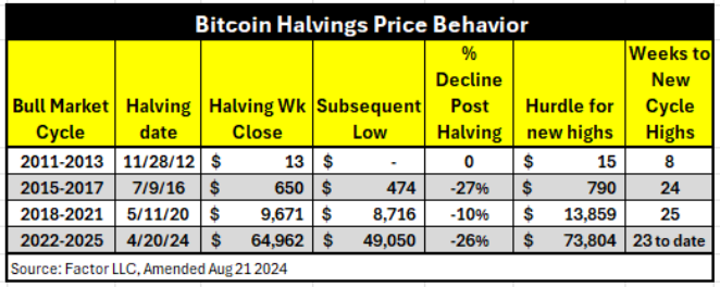 The 2018-2021 cycle brought its own twists. Though the 10% decline post-halving seemed mild, Bitcoin still took 25 weeks to reach a new high of $13,859. The journey through this cycle demonstrated that while Bitcoin had matured, its path to recovery was slower, though steady.