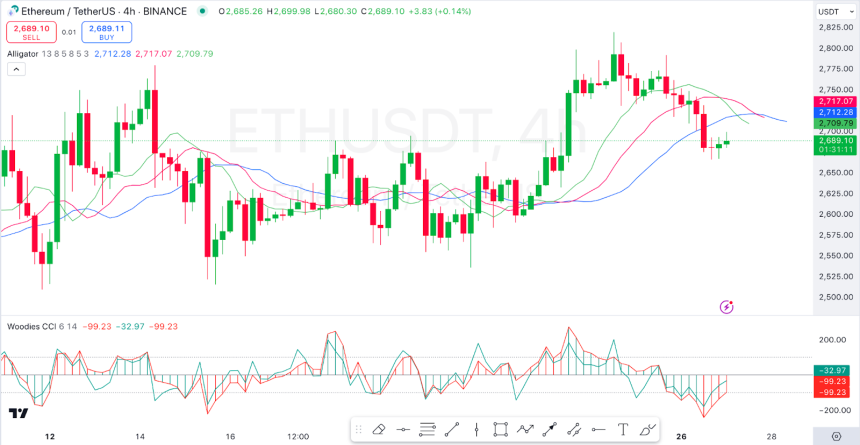 On the other hand, we see that the Woodies CCI is around -99, indicating a potential oversold condition. The red and green lines converging towards the zero line might suggest a possible reversal to the upside. Ethereum traded at $2,678 as of press time, representing a 2.46% decrease over the last 24 hours.
