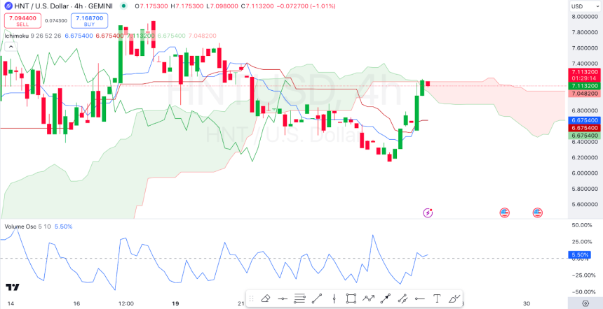 Helium, $HNT, is among the gainers in todays session as also seen from its price movements. Looking at an in-depth analysis we see that the the Helium price is hovering around the cloud, indicating a neutral or uncertain trend. The conversion line is close to the baseline, which could signal an upcoming trend change. A break above the cloud could indicate a bullish trend, while a drop below could signal a bearish continuation.