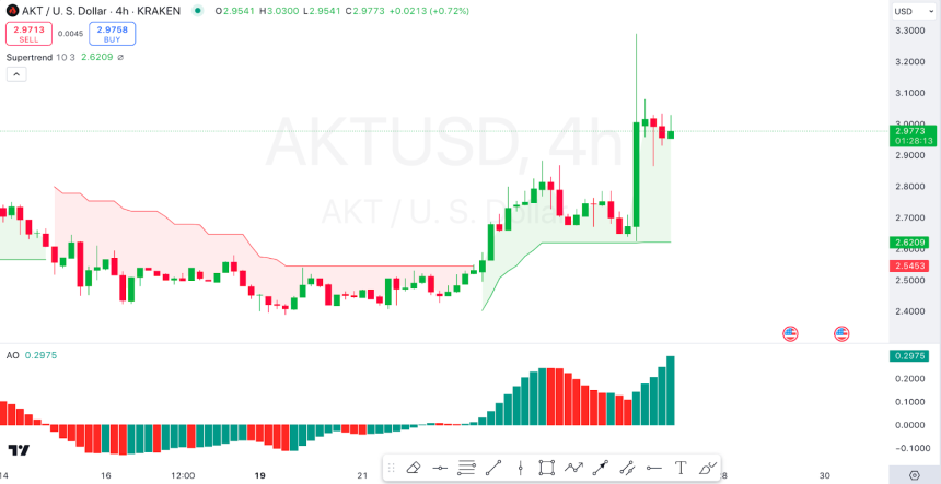 On the other hand, we see that the Awesome Oscillator (AO) is in the positive territory but showing signs of peaking or divergence, which could indicate a potential slowdown in the bullish momentum. Akash Network traded at $2.99 as of press time, representing a 11.96% increase over the last 24 hours.