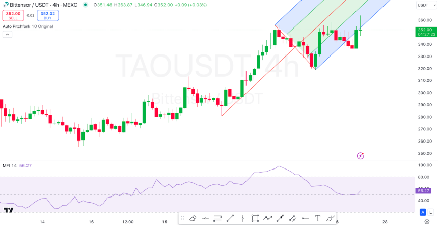 On the other hand, MFI is at 56.27, indicating a relatively neutral condition. If it continues to rise towards 80, it might suggest an overbought condition, potentially leading to a pullback. Bittensor traded at $350.68 as of press time, representing a 2.34% increase over the last 24 hours.