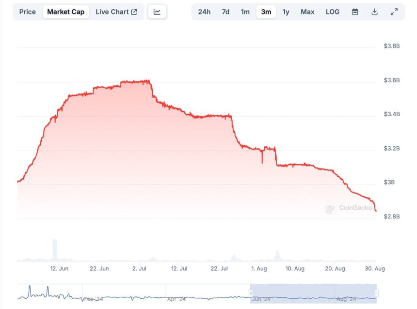 From Aug. 23 to Aug. 30, the stablecoin economy expanded from $169.72 billion to $171.08 billion. Over the past week, the fiat-linked token market saw an uptick of $1.36 billion. However, Ethenas USDE has been on a downward trajectory since reaching its peak market cap on July 4. Back then, 3.61 billion USDE was in circulation, but since that peak, 770 million coins have been redeemed, bringing the market supply down to 2.84 billion USDE.