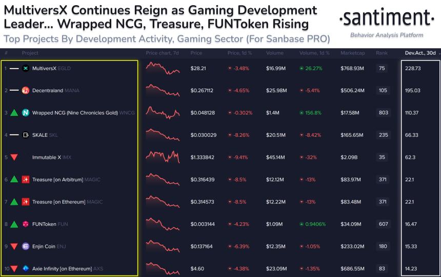 The layer-1 blockchain MultiversX (EGLD) is dominating the crypto gaming sector in terms of development activity, according to the analytics firm Santiment.