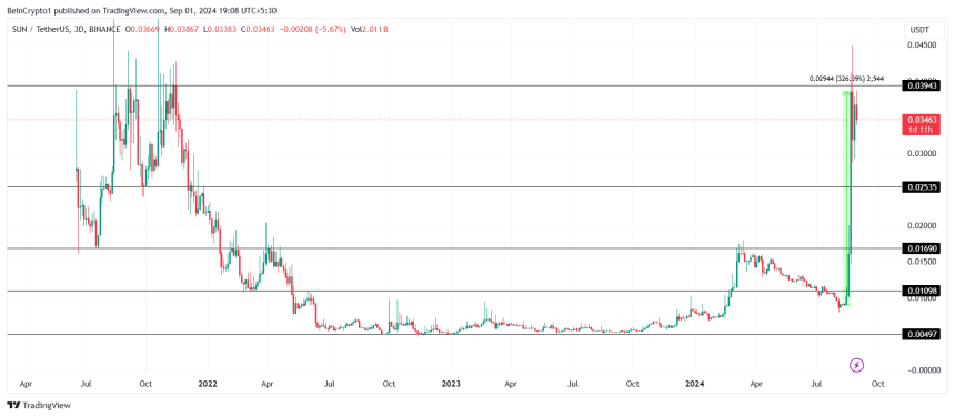 Currently, SUN is trading at $0.0346, hovering just below the critical resistance level of $0.03943. This resistance has proven difficult to break in the past, leading to tempered expectations for a breakout.