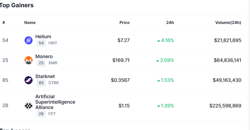 According to the data, Helium (HNT), Monero (XMR), Starknet (STRK), and FET were traded in the green area.