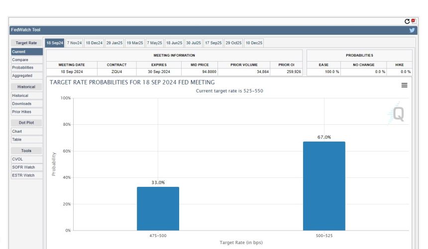 Investors are now confident that the central bank will cut interest rates at the upcoming FOMC meeting, according to the latest data from CME FedWatch. Indeed, the focus is now more on the size of the rate cut, with odds split 67/33 between a 50 basis point cut and a 25 basis point cut.