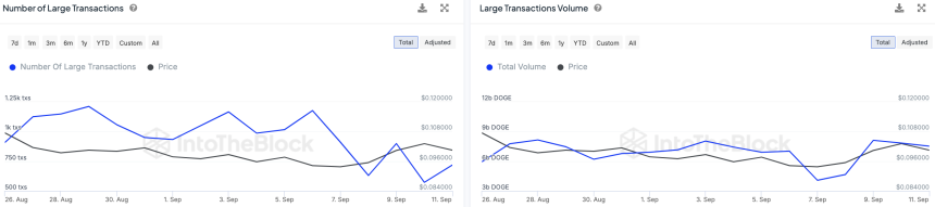 Something strange has been happening with Dogecoin (DOGE) over the past 24 hours. According to IntoTheBlock, the number of large transactions in the meme coin jumped from 571 to 717. These transactions, valued at over $100,000 each, saw an increase of 146 units, representing an additional $14.6 million in transaction activity.