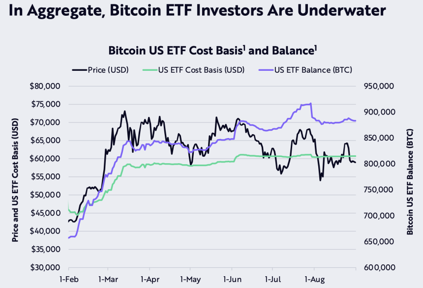 The report highlights that at the end of August 2024, the estimated cost basis of US spot exchange-traded-fund (ETF) participants was higher than BTCs price, hinting that the average ETF investor may be at a loss. The higher estimated cost basis of US spot ETF participants compared to its price can be confirmed from the chart below.