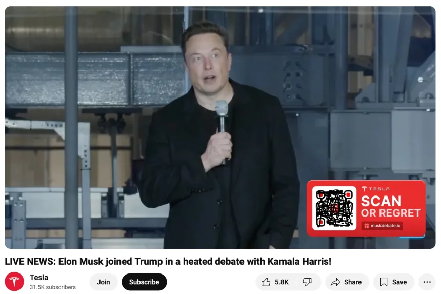 The video, entitled “LIVE NEWS: Elon Musk joined Trump in a heated debate with Kamala Harris!” featured over 60,000 live viewers according to YouTube, but this, of course, could be due to bots.