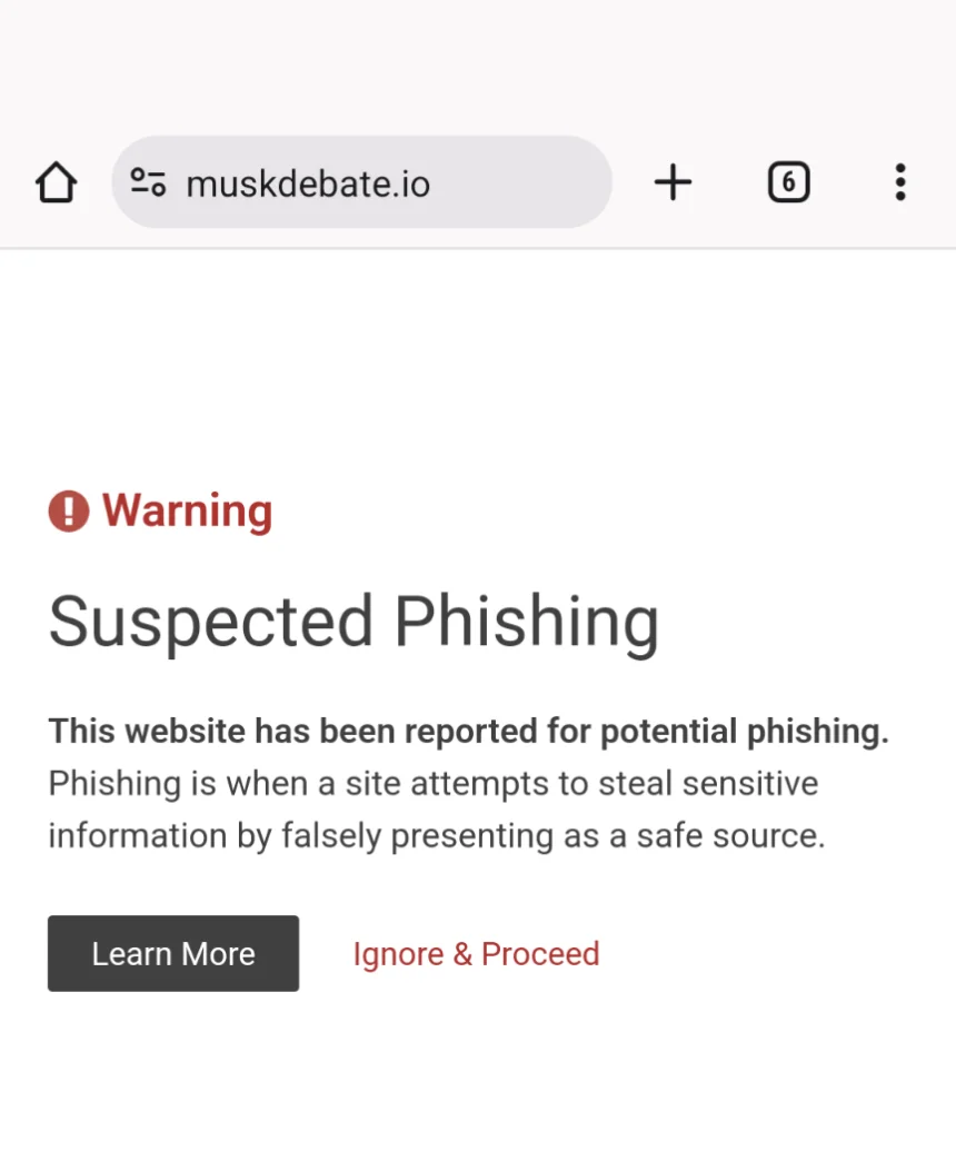 At the time of writing, the “livestream” is still ongoing, and the apparent phishing site linked in the video via QR code, muskdebate.io, appears to have been taken down. The actual verified Tesla account on YouTube has over 2.6 million subscribers, as opposed to 31.5 thousand.