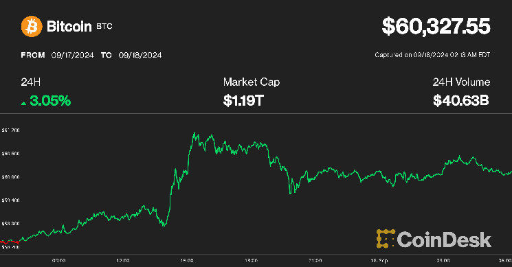 Bitcoin (BTC) held above $60,000 early Wednesday, after a brief tumble below the level in late U.S. hours, as traders around the globe await a U.S. Federal Open Market Committee (FOMC) meeting where chair Jerome Powell is widely expected to announce rate cuts.