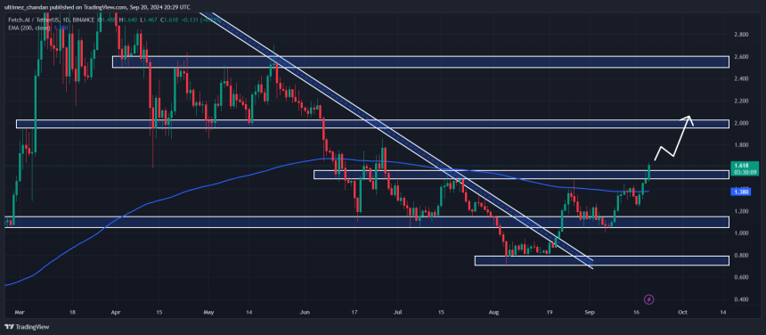 According to expert technical analysis, FET appears bullish and is heading toward the next resistance level of $2. It is currently trading above the 200 Exponential Moving Average (EMA) on a daily time frame, indicating an uptrend. The 200 EMA is a technical indicator used by traders and investors to determine whether an asset is in an uptrend or downtrend.