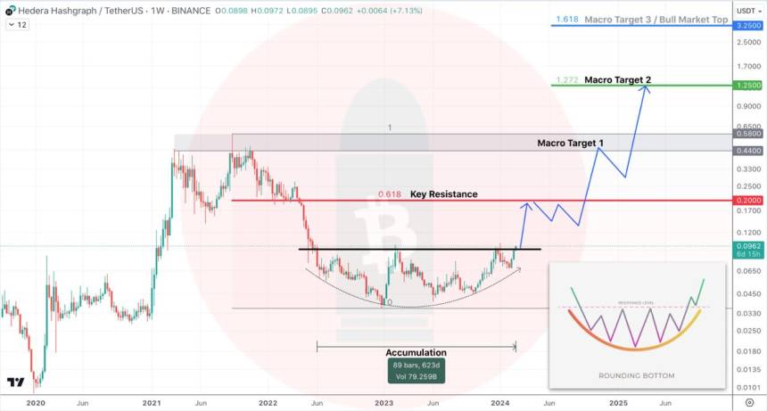 HBAR has been trapped in a long-term accumulation phase for over 600 days, as one analyst noted on X. The immediate resistance stands at $0.0962, and if it breezes past this level, the Fibonacci 0.618 level will be the next major resistance, which stands at $0.2, as shown below.