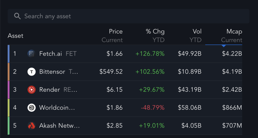 While Bittensor follows closely behind with a market cap of $4.19 billion, FET lead becomes even more pronounced when comparing it to the rest of the field. Combined, Render, Worldcoin, and Akash Network don‘t even match FET’s market cap.
