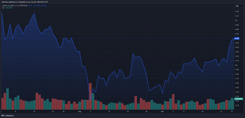 Uniswap‘s UNI has grown in favor of investors as the token continues its upward trajectory in the face of crucial on-chain developments. According to CoinGecko, the token surged 30% since last month, keeping the token on the green zone. With the market’s renewed bullishness, UNI might be on the road for some gains in the short term.