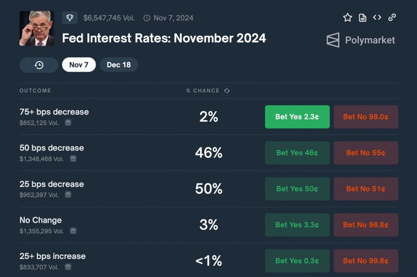 Polymarket gives the quarter-point reduction a 50% chance, while a half-point cut comes in close with 46%. The odds of no rate change stand at 3%, while a quarter-point interest rate hike holds a curious negative 1% probability at the moment.
