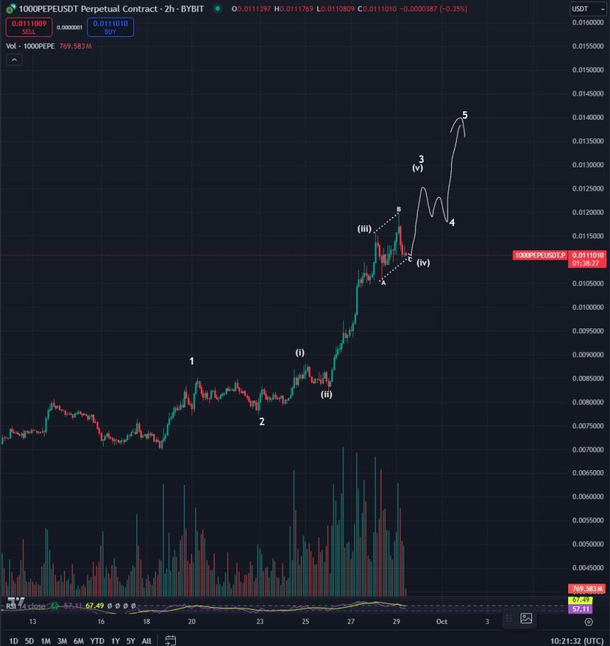 Looking at the traders chart, he seems to suggest that PEPE has completed an ABC pullback amid a wave three surge.