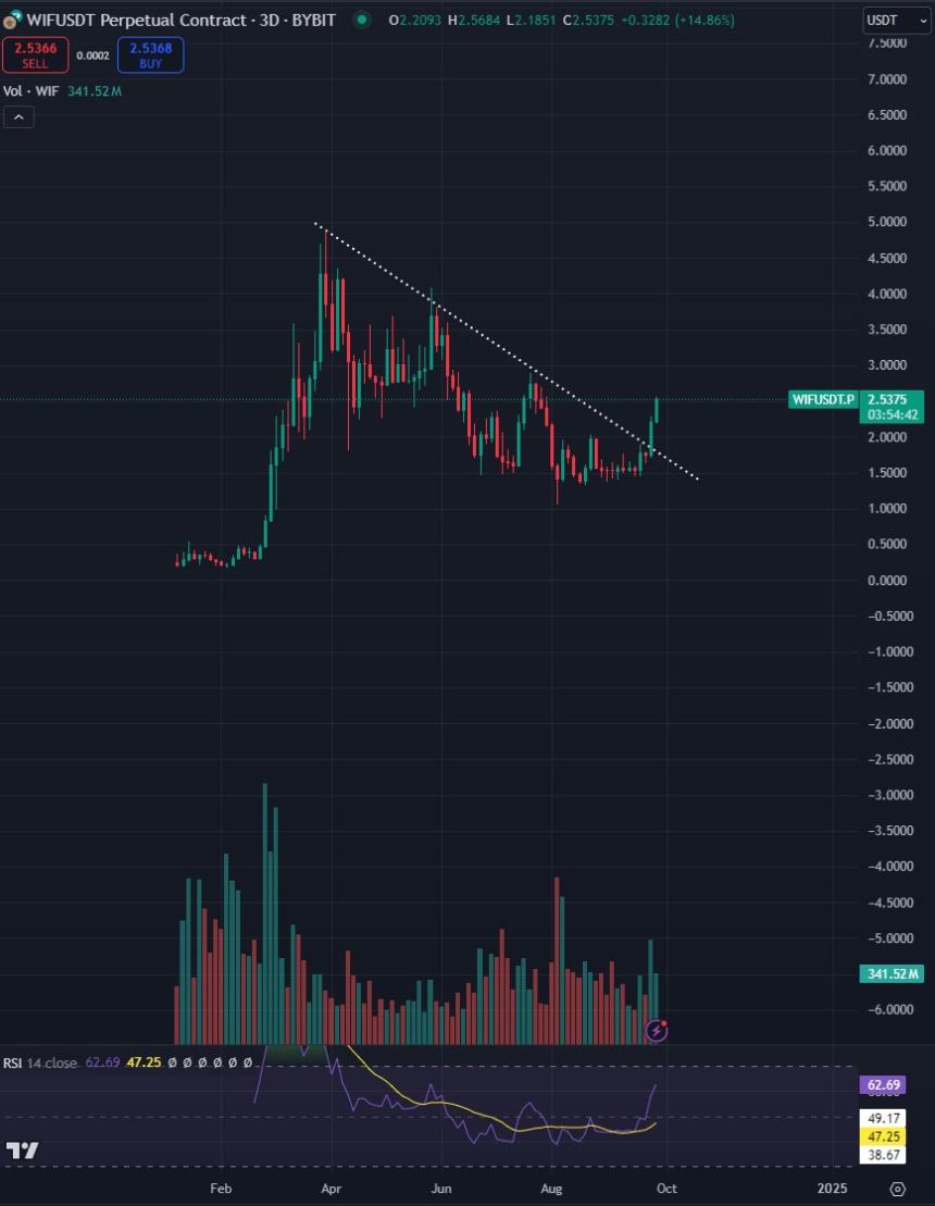 Turning to fellow meme token dogwifhat (WIF), the trader shares a chart suggesting that the Solana (SOL)-based altcoin has taken out a diagonal resistance area that has kept the crypto asset bearish for months.