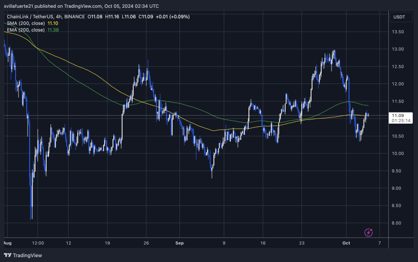 Chainlink (LINK) is currently trading at $11.09 and is testing a key resistance level, the 4-hour 200 moving average (MA) at $11.10, after a 7% surge since Thursday. This level has become a significant hurdle for bulls, as the price has struggled to break above the indicator. For the bullish momentum to continue, LINK must push past this indicator and aim for higher supply zones around $13.