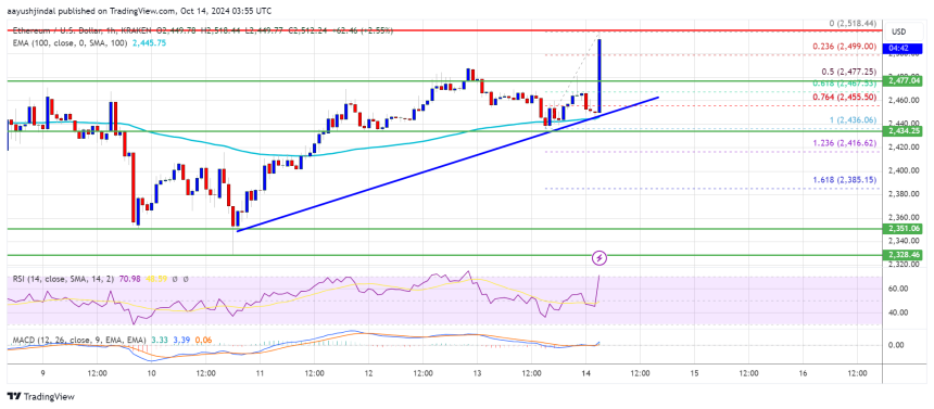 Ethereum price is now trading above $2,450 and the 100-hourly Simple Moving Average. There is also a key bullish trend line forming with support near $2,455 on the hourly chart of ETH/USD.