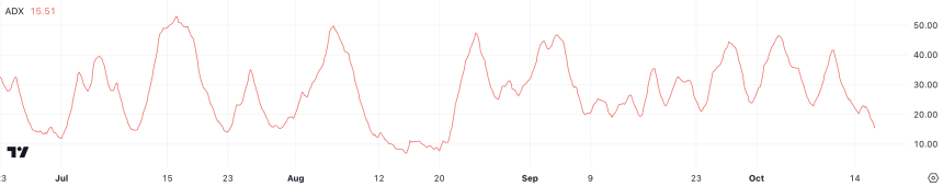 Cardano (ADA) currently has an Average Directional Index (ADX) of 15.51, down sharply from 41 just four days ago. This decline indicates a significant weakening in ADAs trend strength.