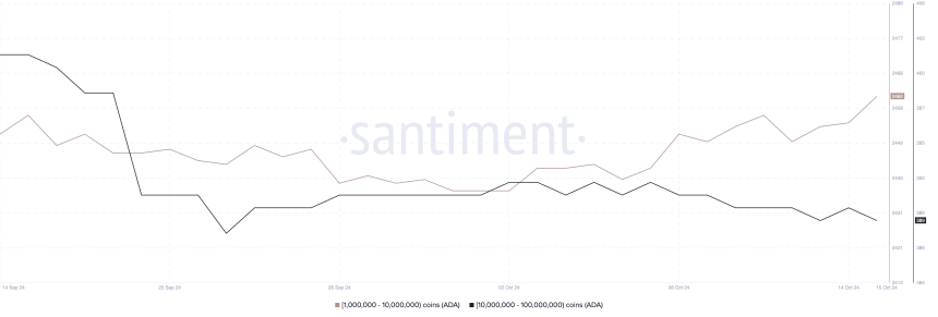In recent weeks, the number of ADA addresses holding between 1 million and 10 million ADA remained relatively stable throughout mid-September until October 7. Similarly, addresses holding between 10 million and 100 million ADA also showed a steady trend since the end of September, following a sharp decline between September 18 and 19.