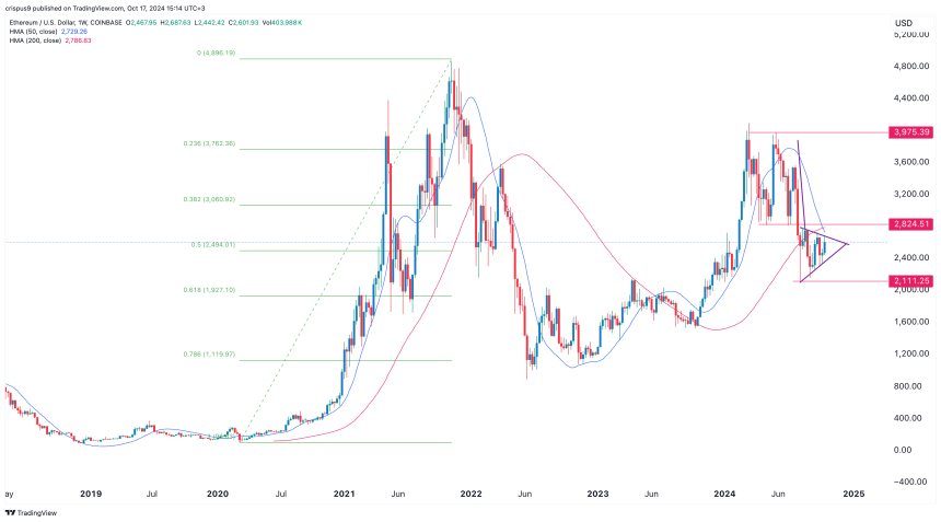 Additionally, this consolidation is happening at the 50% Fibonacci Retracement level. Therefore, there are increasing chances that the coin will have a strong bearish breakout in the near term, with the next target to watch being $2,111, its lowest point on Aug. 5.