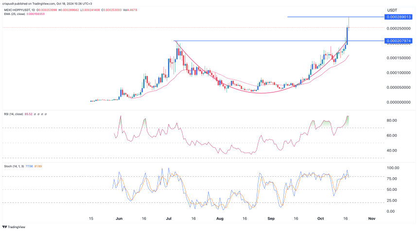 The Hoppy token continued its strong rally, reaching a record high of $0.0002890 on Friday, Oct. 18.