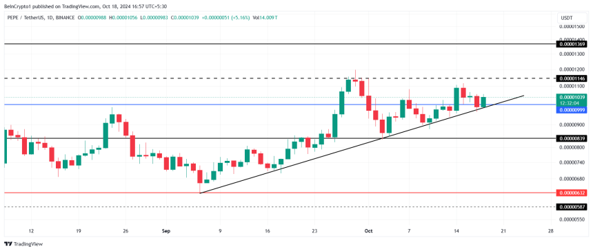 Despite the bullish momentum indicated by the RSI, the mixed signals from other indicators may keep PEPE subdued below the $0.00001146 mark. The coin has established an uptrend line as support, but if it loses this level, PEPE could fall to $0.00000839. This would represent a significant correction, reversing some of its recent gains.