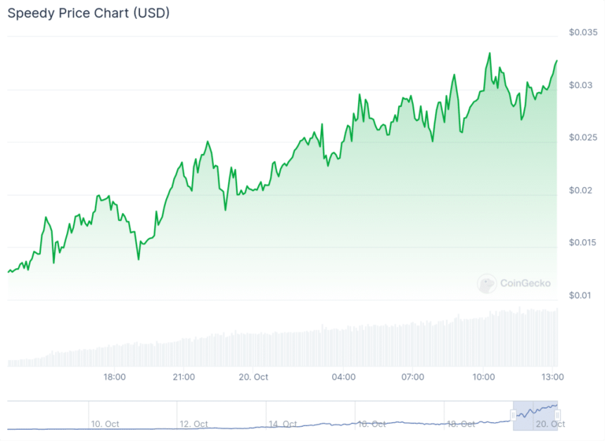 The team behind Speedy, which includes experts in blockchain technology like Gonzales Spidorius serving as the CIO, saw the token spike over 150%. The coins all-time high hovers at around $0.03346; its all-time low was on Oct. 20, at $0.0007253.