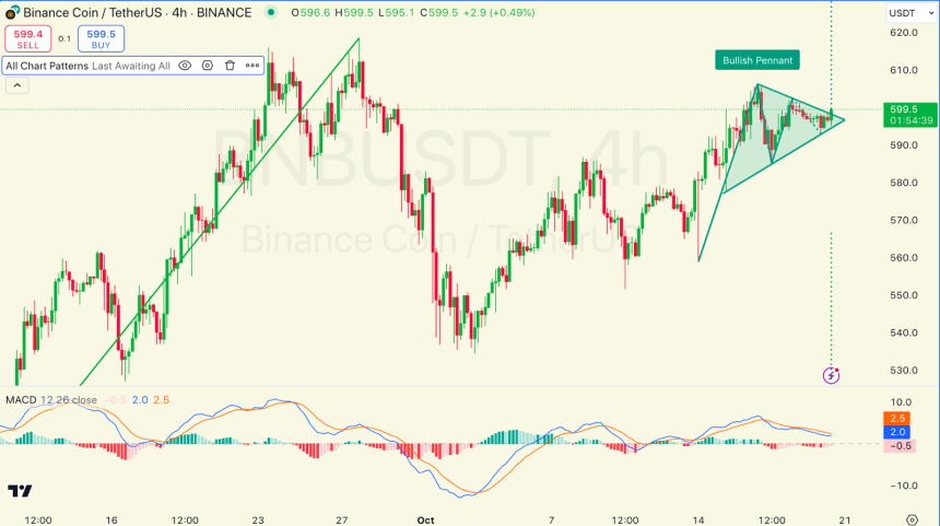 The price ranges between $590 and $600. Nevertheless, a breakout above the upper trendline of the pennant means that the bullish move will continue and may reach subsequent resistances, which could be around $610 or higher.