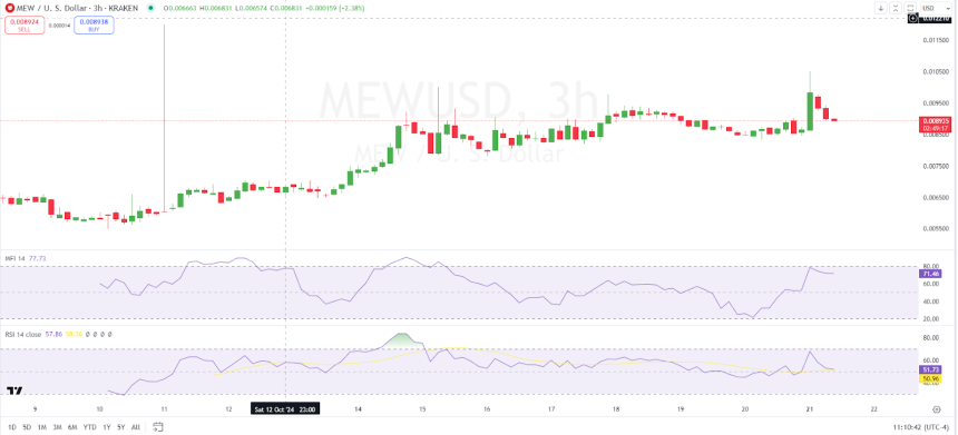 The Relative Strength Index (RSI) a momentum indicator is also in the overbought area suggesting that there might be a slight pull back. According to the market trends, MEW may likely find its support at $0.0089 which is close to the 23.6% Fibonacci retracement level.