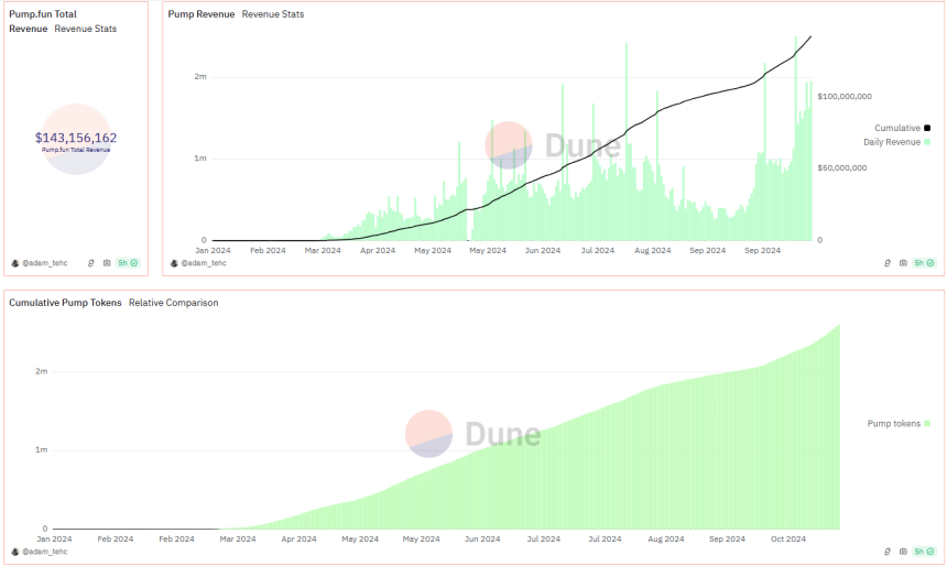 In October, Pump.fun‘s revenue surged, reaching an average of $1.6 million per day, with total revenue now surpassing $143 million. The platform’s financial success stems from tapping into the current market fascination with meme coins.