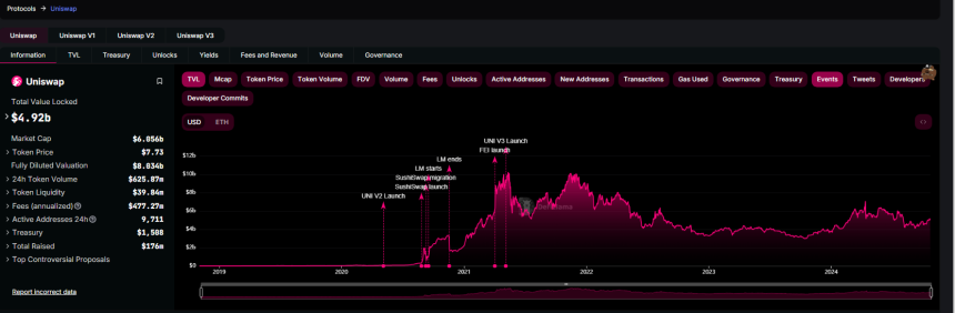 For the unique value proposition Uniswap presents, the platform continues to grow by leaps and bounds. The latest data from DeFiLlama reveals that the DEX manages over $4.9 billion worth of assets.